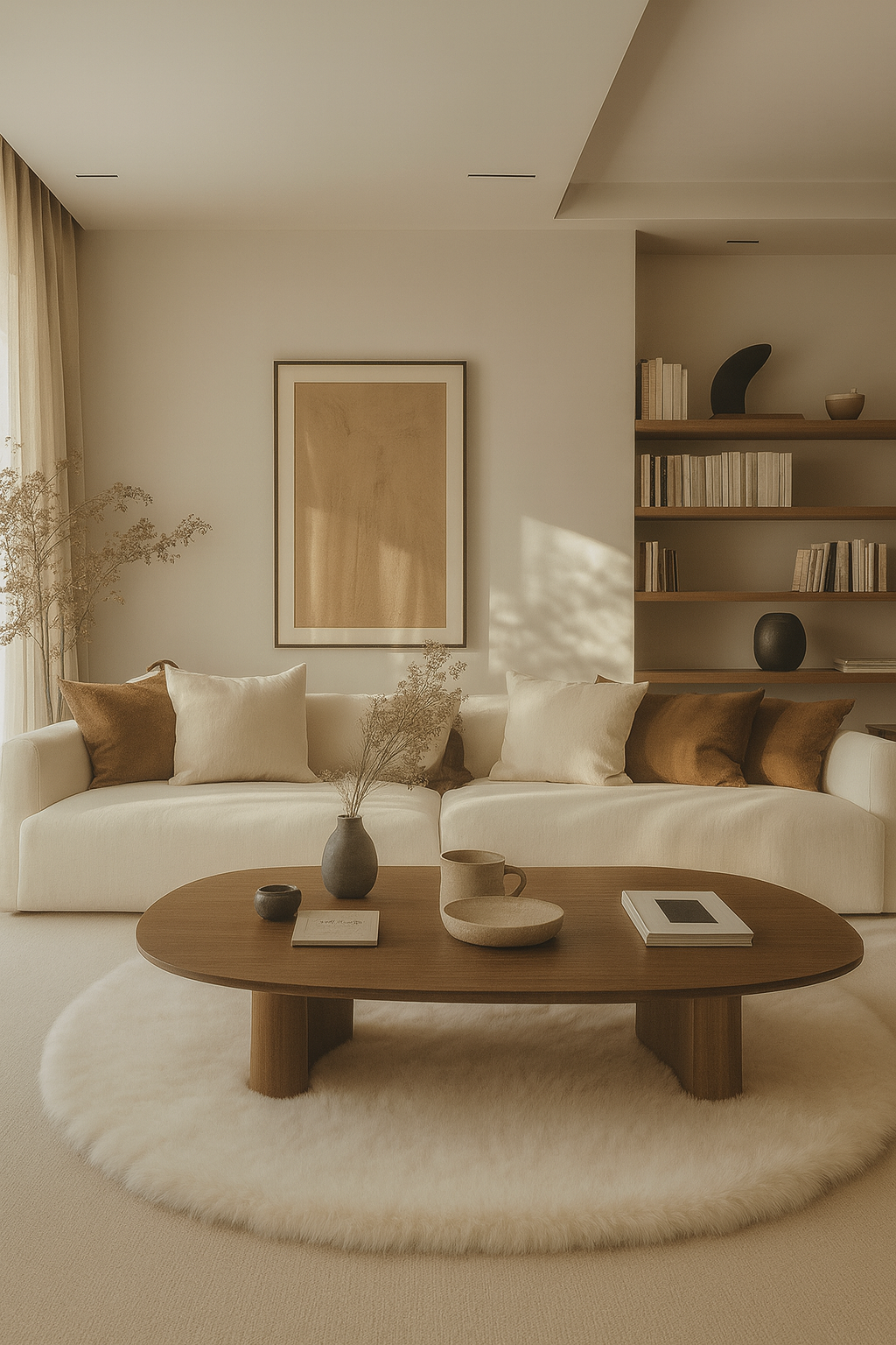 Carpete redonda em tons neutros com um aspeto intemporal, versátil e fácil de combinar com diferentes decorações.