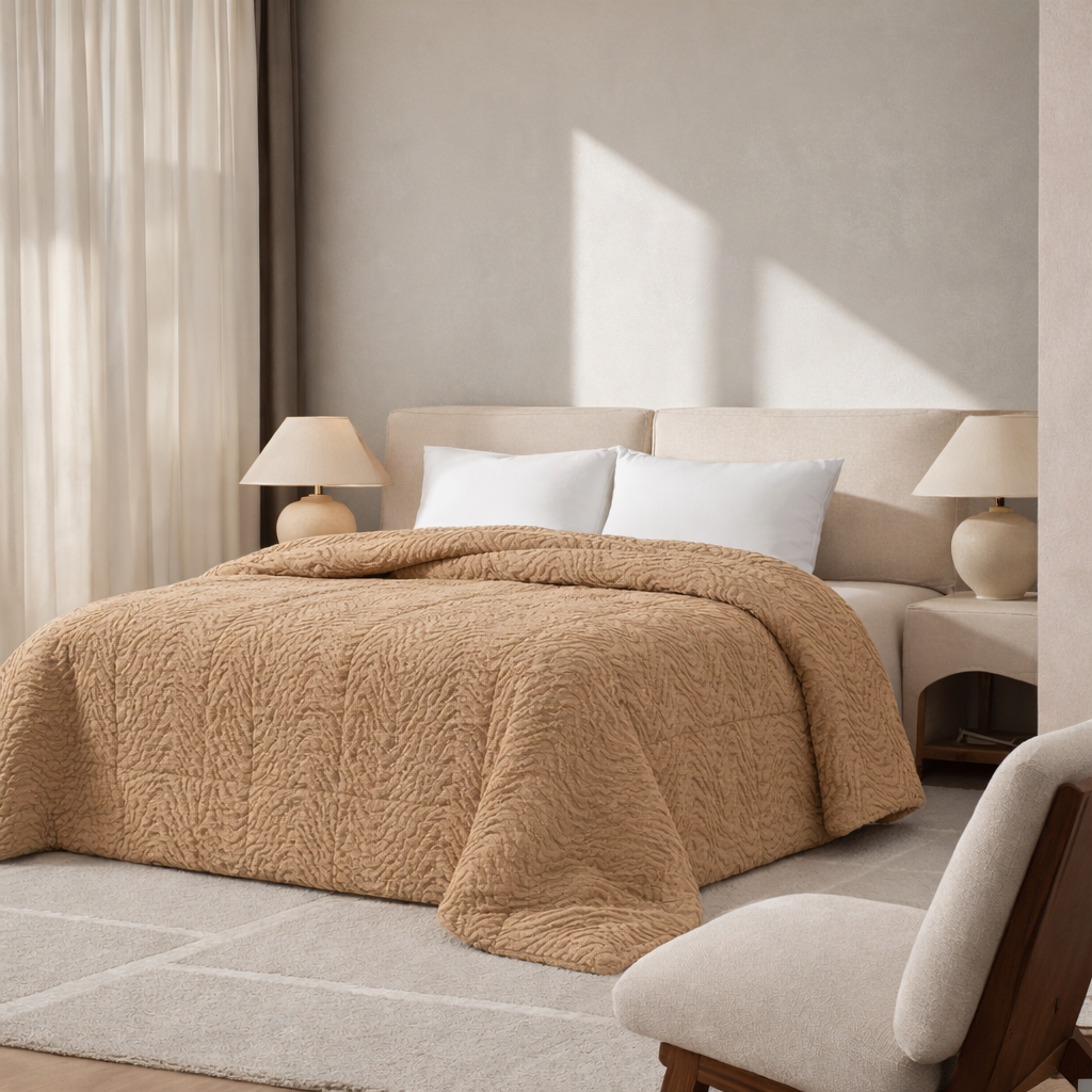 Edredão de borrego ideal para quem procura um maior conforto para as noites frias, apresentando uma composição de alta qualidade, um toque muito suave e aconchegante.