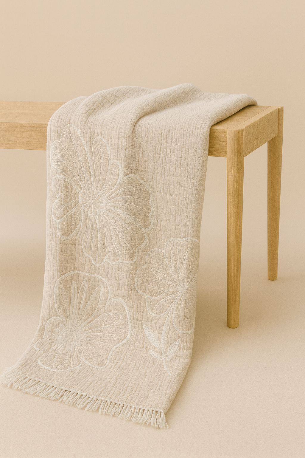 Manta composta por algodão e um design liso. Pode ser utilizada como manta, como capa de sofá, como cobre-pés ou como peça decorativa.