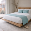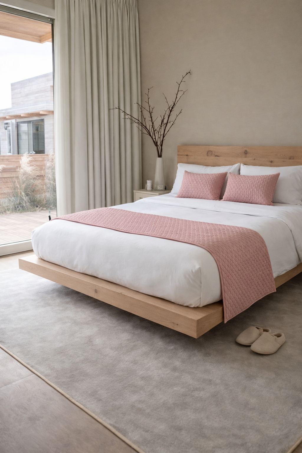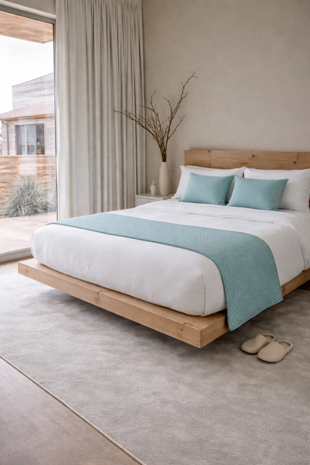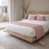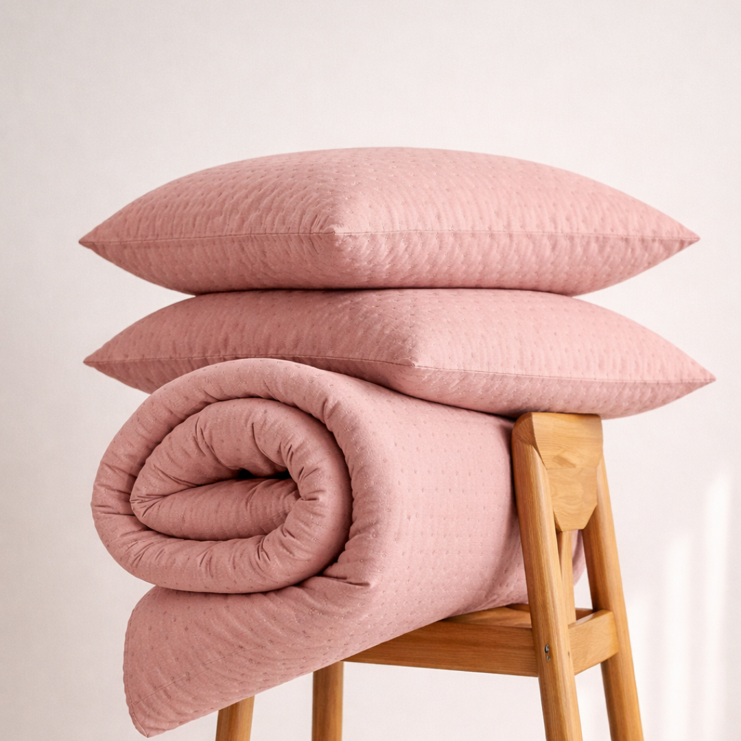 O nosso tapa pés com duas almofadas, através dos seus tons neutros, combinam com texturas suaves e detalhes, trazendo equilíbrio, conforto e elegância ao quarto.